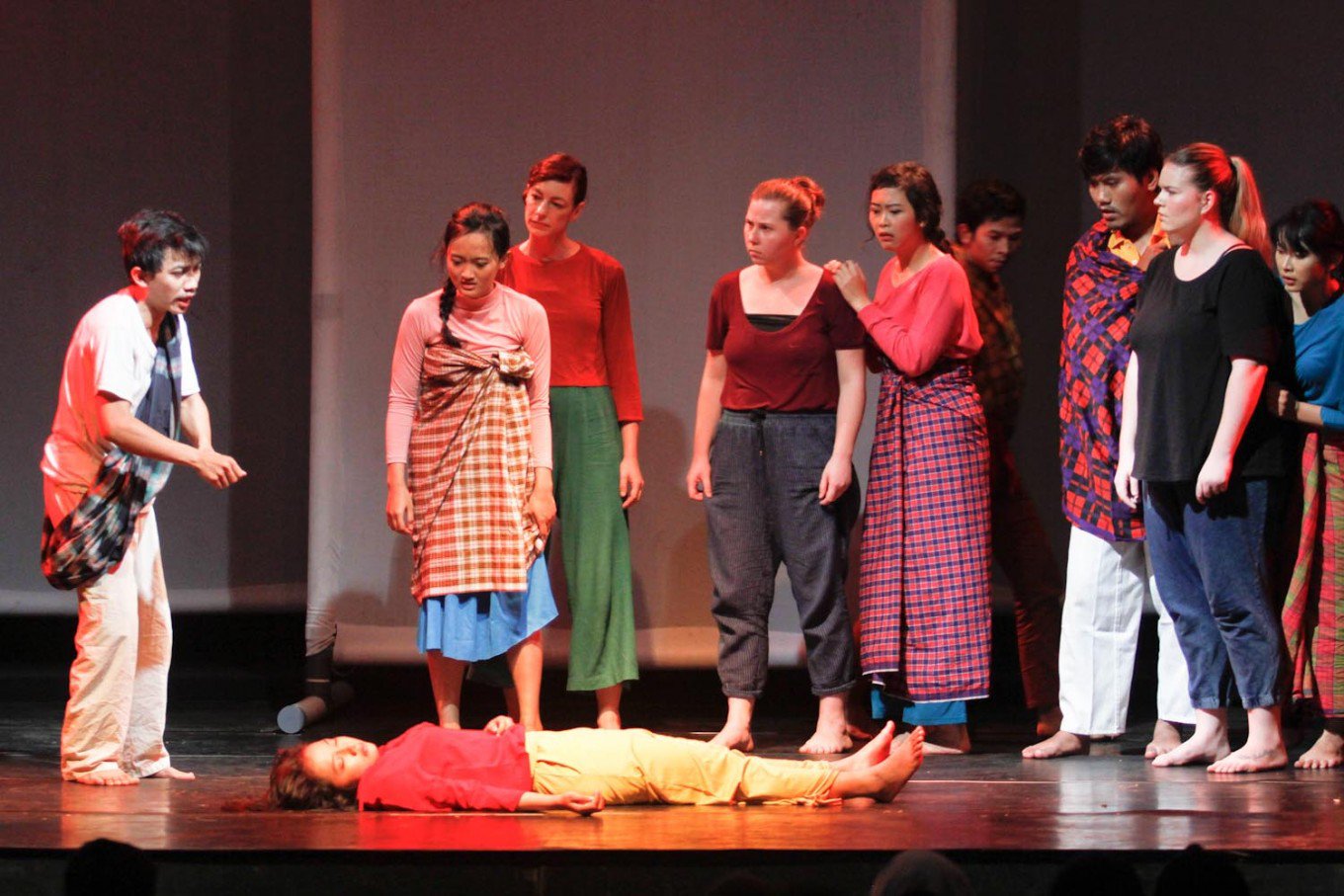 The interrogation of Indonesian fishermen in the play Cahaya Memintas Malam was one of diverse interactions devised by the student writer-actors on the broad theme of encounter with the Other. The framing story, an Indonesian folk-tale performed by the Indonesian students, depicts a poor farmer attempting to fish outside his own village area. The man is accused of killing a woman found in the stream, and is subsequently executed. When butterflies drawn by the sweet scent of the innocent man’s body block out the sun, causing crops to fail, the villagers acknowledge that they had been wrong to blame and punish the man simply because he was an outsider.