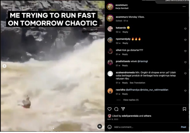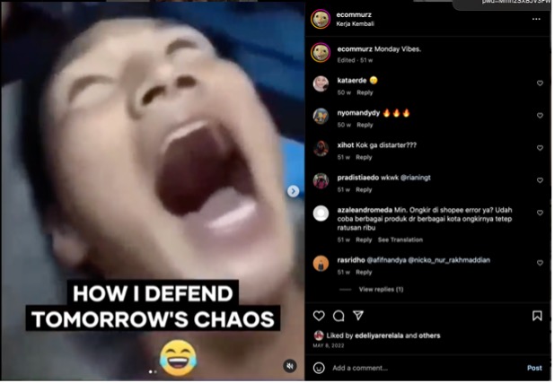 The post above was published just as the Eid holiday ended alongside the caption ‘Monday vibes’. The post contained two videos, with text added by Ecommurz, which suggested that the tasks given to employees will be overwhelming after a long break. The first video shows a young man being held down by multiple people and yelling loudly as other men tickle his body. Ecommurz added the text in the video, ‘How I defend tomorrow's chaos’. To me, the clip indicates how, despite trying to anticipate the tasks after the holiday, startup workers will most likely be helpless, just like the guy overwhelmed by the tickle.