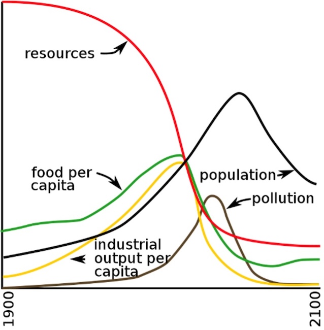 Figure 2 menunjukkan simulasi 'business as usual'. Bagian kanan gambar ini merupakan ramalan yang dihasilkan komputer. Masalah yang pertama muncul adalah habisnya sumber daya alam, terdiri atas barang seperti besi dan minyak bumi. Kehabisan itu mempengaruhi produksi baik pangan maupun barang industrial. Sementara itu, polusi bertumbuh terus. Sebagai akibat, jumlah penduduk manusia di bumi anjlok secara dramatis akibat kelaparan dan kesengsaraan lain termasuk dampak polusi. Kiamat!