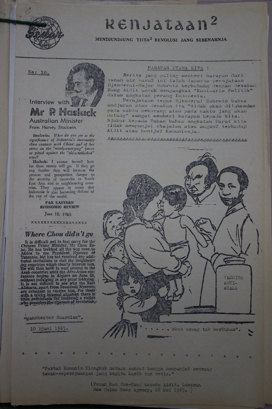 The newsletter was named Kenjataan2 (‘Facts’) and contained reportage, comment, and satirical cartoons on Indonesian current affairs by a group of fictitious regular contributors. The first copies of the newsletter were posted in April 1965, addressed to between 800 and 1500 ‘personages of influence’ in Indonesia, as well as handful of Indonesian diplomats in Europe. According to a later internal IRD report, the publication was even brought to the attention of Sukarno, although it is not known if he ever saw it, let alone read it. As to its content, it was not unlike a tabloid newspaper with virulently anti-Sukarno, anti-China and anti-Konfrontasi views – though its most inflammatory language was always reserved for the PKI.